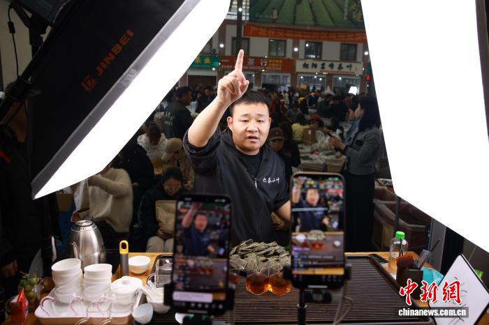 3月31日,创业青年亿茶小叶正在收集曲播发售茶叶。中新社记者 孙杨洋 摄
